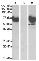 - HEK293 lysate (10 µg protein in RIPA buffer) overexpressing Human EPM2AIP1 with DYKDDDDK tag probed with EPM2AIP1 Antibody Cat.-No AP23655PU-N (1 µg/ml) in Lane A and probed with anti-DYKDDDDK Tag (1/1000) in lane C. Mock-transfected HEK293 probed with AP23655PU-N (1 mg/ml) in Lane B. Primary incubations were for 1 hour. Detected by chemiluminescence.