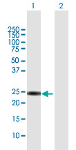 - Western Blot analysis of KIF26A expression in transfected 293T cell line (H00026153-T02) by KIF26A MaxPab polyclonal antibody.Lane 1: KIF26A transfected lysate(22.5 KDa).Lane 2: Non-transfected lysate.