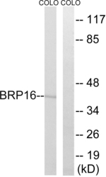 - Western blot analysis of lysates from COLO cells, using BRP16 Antibody. The lane on the right is blocked with the synthesized peptide.