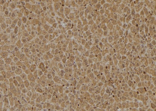 - 1:100 staining mouse liver tissue by IHC-P. The sample was formaldehyde fixed and a heat mediated antigen retrieval step in citrate buffer was performed. The sample was then blocked and incubated with the antibody for 1.5 hours at 22°C. An HRP conjugated goat anti-rabbit antibody was used as the secondary.