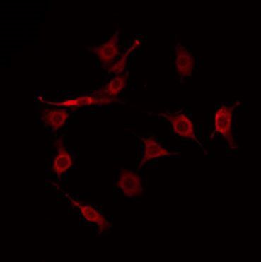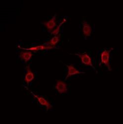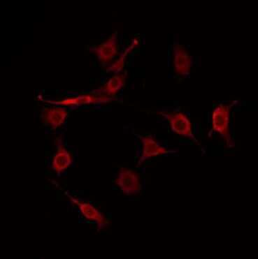 - Immunofluorescent analysis of HGH1 in COLO205 cells. Samples were fixed with paraformaldehyde, permeabilized with 0.1% Triton X-100, blocked with 10% serum (45 min at 25°C) incubated with HGH1 polyclonal antibody (Product # PA5-101467) using a dilution of 1:200 (1 hr, 37°C), and followed by goat anti-rabbit IgG Alexa Fluor 594 at a dilution of 1:600.