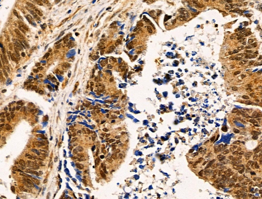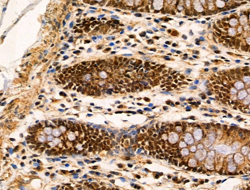 - Immunohistochemistry analysis of HGH1 in human colorectal cancer. The sample was formaldehyde fixed and a heat mediated antigen retrieval step in citrate buffer was performed. Samples were incubated with HGH1 polyclonal antibody (Product # PA5-101467) using a dilution of 1:100 (4°C overnight) followed by HRP conjugated anti-Rabbit secondary antibody.