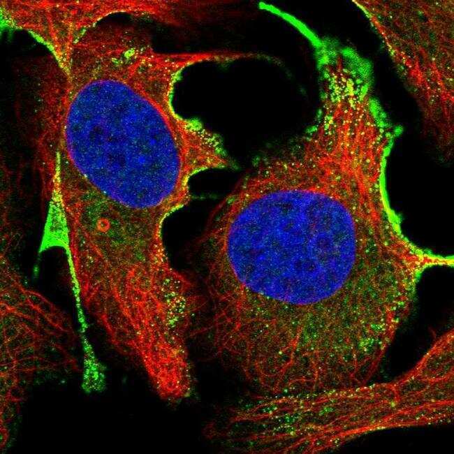 - Immunofluorecent analysis of CTDSPL in human cell line U-2 OS using CTDSPL Polyclonal Antibody (Product # PA5-61713). Staining shows localization to vesicles.