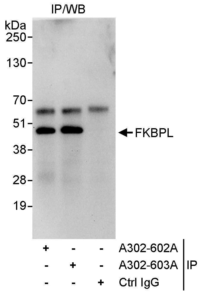 - Detection of human FKBPL by western blot of immunoprecipitates. Samples: Whole cell lysate (1 mg for IP, 20% of IP loaded) from HeLa cells. Antibodies: Affinity purified rabbit anti-FKBPL antibody A302-603A used for IP at 3 µg/mg lysate. FKBPL was also immunoprecipitated by rabbit anti-FKBPL antibody A302-602A, which recognizes an upstream epitope. For blotting immunoprecipitated FKBPL, A302-602A was used at 1 µg/ml. Detection: Chemiluminescence with an exposure time of 30 seconds.