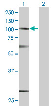 - Western Blot analysis of SUSD2 expression in transfected 293T cell line (H00056241-T02) by SUSD2 MaxPab polyclonal antibody.Lane 1: SUSD2 transfected lysate(90.42 KDa).Lane 2: Non-transfected lysate.