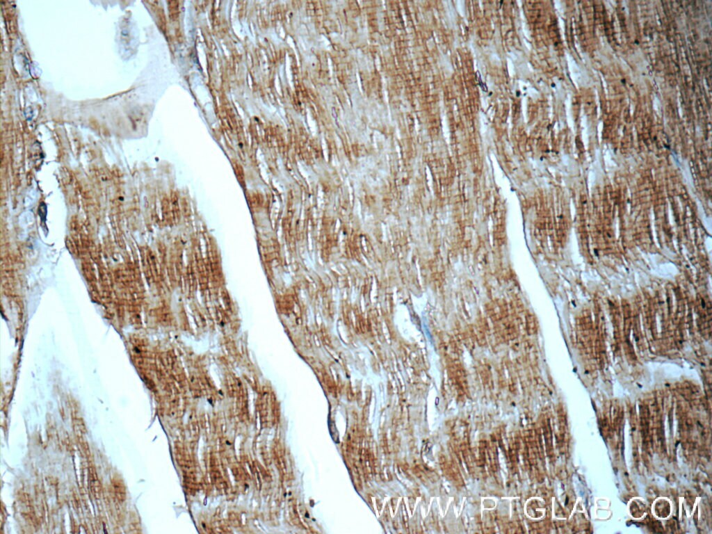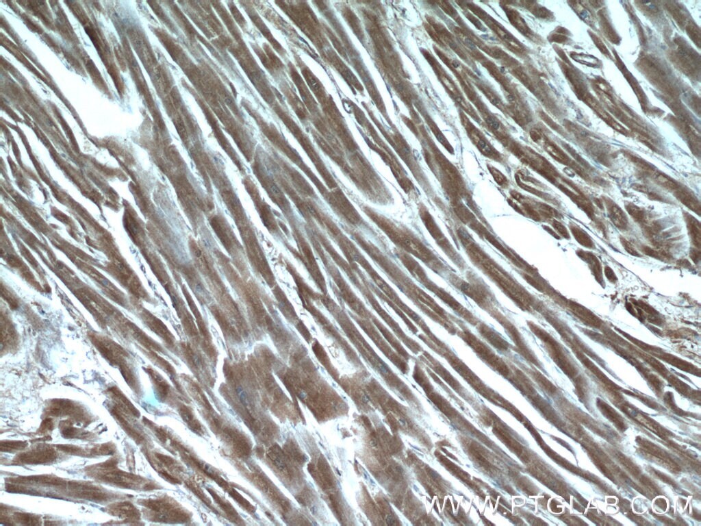 - Immunohistochemistry of paraffin-embedded human heart tissue slide using 16180-1-AP (MYPN-Specific Antibody) at dilution of 1:50 (under 40x lens).