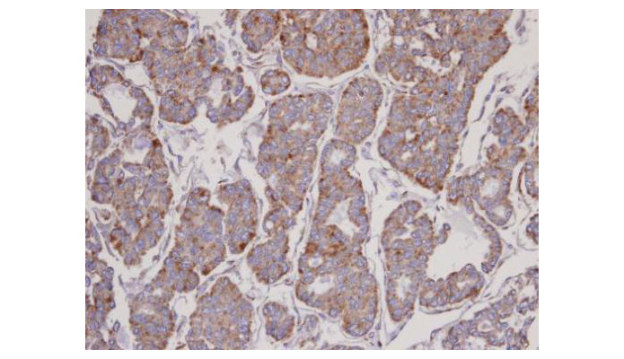 - Immunohistochemical analysis of paraffin-embedded Thyroid Ca, using FBL6(OAGA00360) antibody at 1:100 dilution.