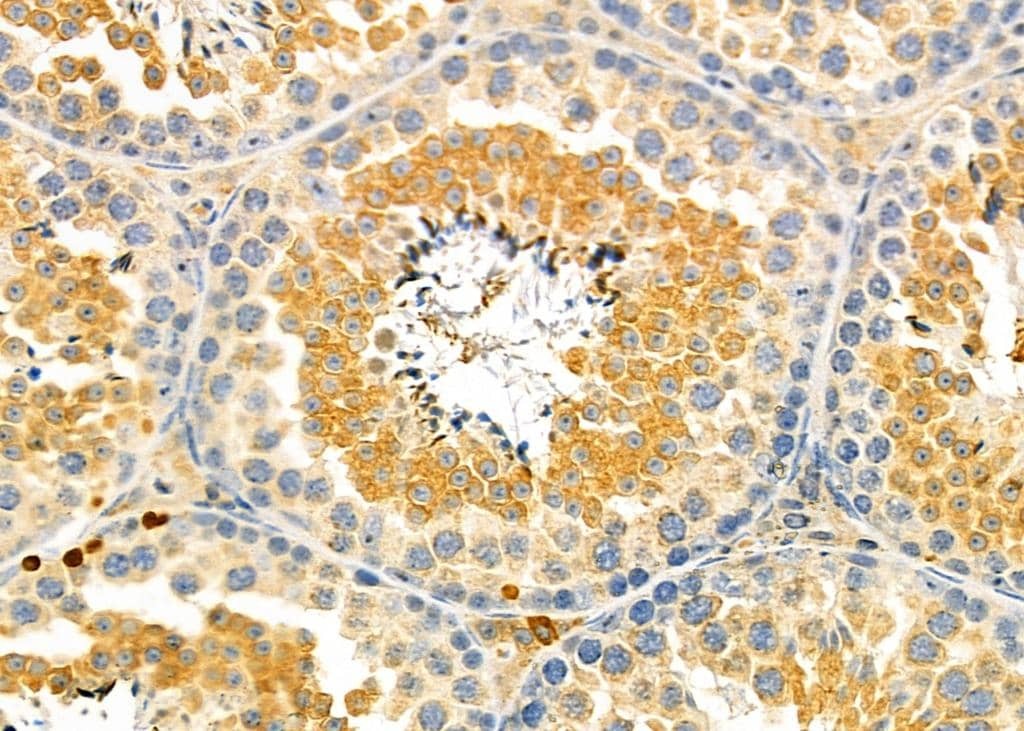 - Immunohistochemistry analysis of PBX4 in mouse testis tissue. The sample was formaldehyde fixed and a heat mediated antigen retrieval step in citrate buffer was performed. Samples were incubated with PBX4 polyclonal antibody (Product # PA5-104032) using a dilution of 1:100 (4°C overnight) followed by HRP conjugated anti-Rabbit secondary antibody.