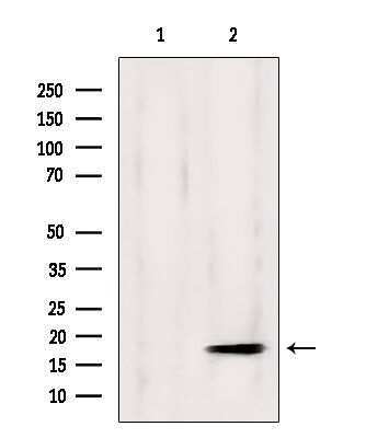 - Western blot analysis of GPSM3 in mouse muscle (Lane 1: treated with blocking peptide). Samples were incubated with GPSM3 polyclonal antibody (Product # PA5-103862).