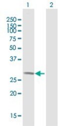 - Western Blot analysis of WBSCR28 expression in transfected 293T cell line (H00135886-T01) by WBSCR28 MaxPab polyclonal antibody.Lane 1: WBSCR28 transfected lysate(29.15 KDa).Lane 2: Non-transfected lysate.