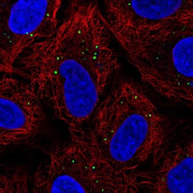 - Immunofluorescent staining of Krt222 in human cell line A549 using a Krt222 Polyclonal Antibody (Product # PA5-62986) shows localization to vesicles.