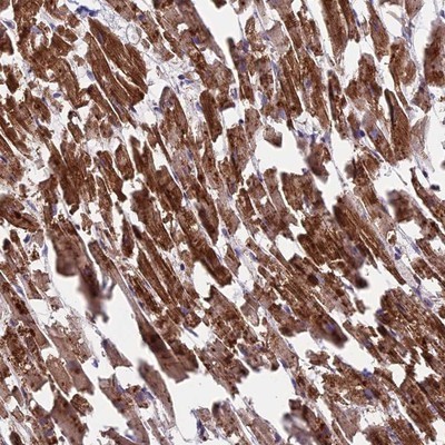 - Immunohistochemistry-Paraffin: KRT222 Antibody [NBP1-92061] - Staining of human heart muscle shows strong cytoplasmic positivity in myocytes.