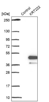 - Western Blot: KRT222 Antibody [NBP1-92061] - Analysis in control (vector only transfected HEK293T lysate) and KRT222 over-expression lysate (Co-expressed with a C-terminal myc-DDK tag (3.1 kDa) in mammalian HEK293T cells).
