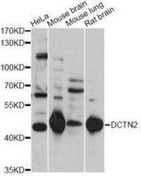 - Western blot analysis of extracts of various cell lines, using DCTN2 antibody at 1:1000 dilution. The secondary antibody used was an HRP Goat Anti-Rabbit IgG (H+L) at 1:10000 dilution. Lysates were loaded 25ug per lane and 3% nonfat dry milk in TBST was used for blocking. An ECL Kit was used for detection and the exposure time was 30s.
