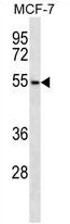 - ARMCX1 Antibody (Center) western blot analysis in MCF-7 cell line lysates (35ug/lane).This demonstrates the ARMCX1 antibody detected the ARMCX1 protein (arrow).