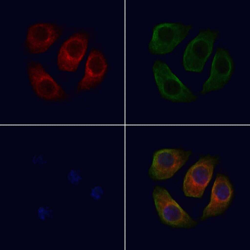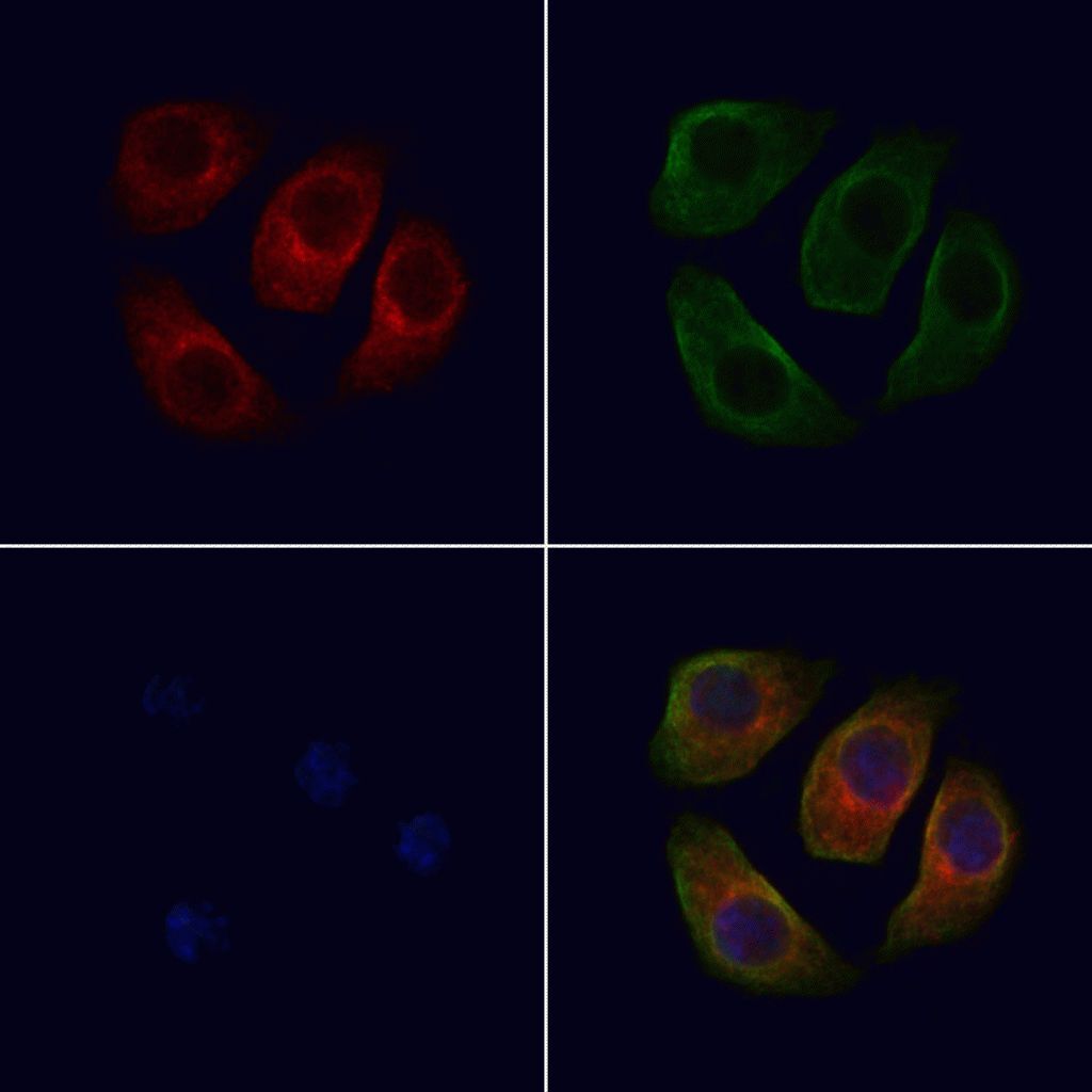 - Immunofluorescent analysis of ARMX1 in HeLa cells. Samples were fixed with paraformaldehyde, permeabilized with 0.1% Triton X-100, blocked with 10% serum (45 min at 25°C), incubated with mouse anti-beta tubulin and ARMX1 polyclonal antibody (Product # PA5-99587) using a dilution of 1:200 (1 hr, 37°C), and followed by goat anti-rabbit IgG Alexa Fluor 594 (red) and goat anti-mouse IgG Alexa Fluor 488 (green).