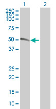 - Western Blot analysis of C15orf58 expression in transfected 293T cell line (H00390637-T01) by C15orf58 MaxPab polyclonal antibody.Lane 1: LOC390637 transfected lysate(42.35 KDa).Lane 2: Non-transfected lysate.