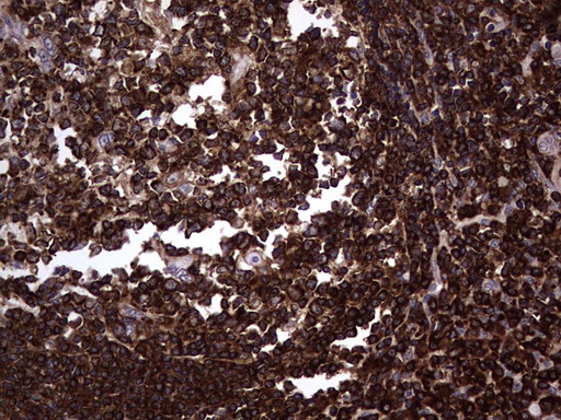 - Immunohistochemical staining of paraffin-embedded Human lymphoma tissue using anti-DOCK2 mouse monoclonal antibody. (UM800039; heat-induced epitope retrieval by 1 mM EDTA in 10mM Tris, pH8.5, 120C for 3min)