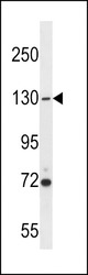 - USP7 Antibody (Center) (Cat. #AP16712c) western blot analysis in A2058 cell line lysates (35ug/lane).This demonstrates the USP7 antibody detected the USP7 protein (arrow).