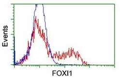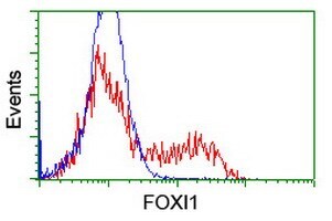 - HEK293T cells transfected with either RC218102 overexpress plasmid (Red) or empty vector control plasmid (Blue) were immunostained by anti-FOXI1 antibody (TA800145), and then analyzed by flow cytometry.