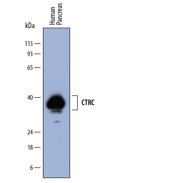 - Detection of Human Chymotrypsin C/CTRC by Western Blot. Western blot shows lysates of human pancreas tissue. PVDF membrane was probed with 1 µg/mL of Sheep Anti-Human Chymotrypsin C/CTRC Antigen Affinity-purified Polyclonal Antibody (Catalog # AF6907) followed by HRP-conjugated Anti-Sheep IgG Secondary Antibody (Catalog # HAF016). A specific band was detected for Chymotrypsin C/CTRC at approximately 33-40 kDa (as indicated). This experiment was conducted under reducing conditions and using Immunoblot Buffer Group 1.</P>