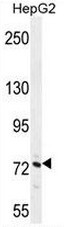 - CTND1 Antibody (Center) (Cat. #AP51125PU-N) western blot analysis in HepG2 cell line lysates (35µg/lane).This demonstrates the CTND1 antibody detected the CTND1 protein (arrow).