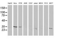 - Western blot analysis of extracts (35 µg) from 9 different cell lines by using anti-C20orf43 monoclonal antibody.