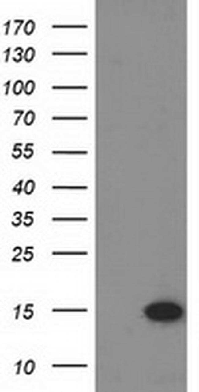 - HEK293T cells were transfected with the pCMV6-ENTRY control (Left lane) or pCMV6-ENTRY EIF1 (RC201271, Right lane) cDNA for 48 hrs and lysed. Equivalent amounts of cell lysates (5 µg per lane) were separated by SDS-PAGE and immunoblotted with anti-EIF1. Positive lysates LY401762 (100 µg) and LC401762 (20 µg) can be purchased separately from OriGene.