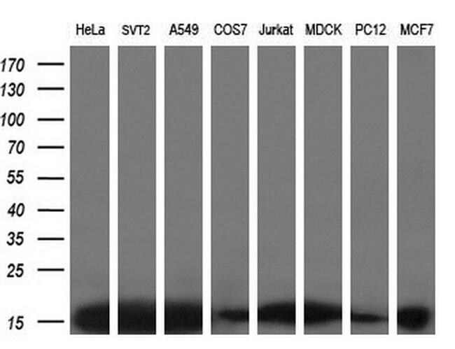 - Western blot analysis of extracts (10 µg) from 8 different cell lines by using anti-EIF1 monoclonal antibody at 1:200 dilution.