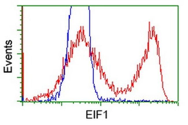 - Flow cytometric analysis of Jurkat cells, using anti-EIF1 antibody (TA502844), (Red), compared to a nonspecific negative control antibody, (Blue).
