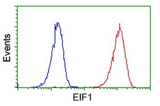 - Flow cytometric analysis of Hela cells, using anti-EIF1 antibody (TA502844), (Red), compared to a nonspecific negative control antibody, (Blue).