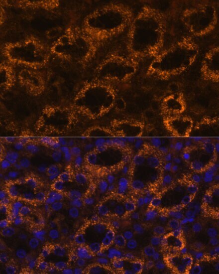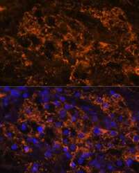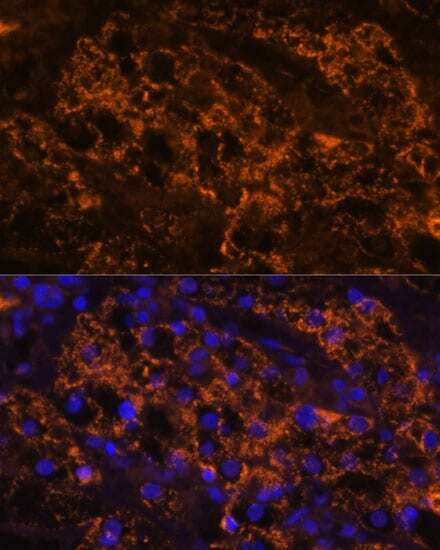 - Immunohistochemistry (Immunofluorescence) analysis of SLC7A9 in human kidney cancer. Samples were incubated with SLC7A9 Polyclonal antibody (Product # PA5-110394) using a dilution of 1:100. Blue: DAPI for nuclear staining.