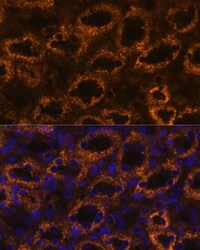 - Immunohistochemistry (Immunofluorescence) analysis of SLC7A9 in rat kidney. Samples were incubated with SLC7A9 Polyclonal antibody (Product # PA5-110394) using a dilution of 1:100. Blue: DAPI for nuclear staining.