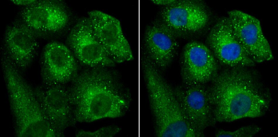 - Immunofluorescent analysis of BHLHB9 in A549 cells (green). Samples were fixed in paraformaldehyde and permeabilised with 0.25% Triton X100/PBS, incubated with BHLHB9 polyclonal antibody (Product # PA5-109250), followed by DAPI (blue).
