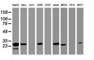 - Western blot of extracts (35 ug) from 9 different cell lines by using anti-HSD17B8 monoclonal antibody (HepG2: human; HeLa: human; SVT2: mouse; A549: human; COS7: monkey; Jurkat: human; MDCK: canine; PC12: rat; MCF7: human).