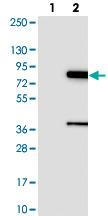 - Western blot analysis of Lane 1: Negative control (vector only transfected HEK293T lysate).Lane 2: Over-expression lysate (Co-expressed with a C-terminal myc-DDK tag (~3.1 kDa) in mammalian HEK293T cells with KATNB1 polyclonal antibody (Cat # PAB23861).