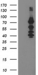 - HEK293T cells were transfected with the pCMV6-ENTRY control (Left lane) or pCMV6-ENTRY KATNB1 (RC201852, Right lane) cDNA for 48 hrs and lysed. Equivalent amounts of cell lysates (5 µg per lane) were separated by SDS-PAGE and immunoblotted with anti-KATNB. Positive lysates LY417004 (100 µg) and LC417004 (20 µg) can be purchased separately from OriGene.