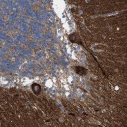 - Immunohistochemical staining of human cerebellum shows strong cytoplasmic positivity in Purkinje cells.