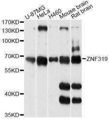 - Western blot analysis of extracts of various cell lines, using ZNF319 antibody at 1:3000 dilution. The secondary antibody used was an HRP Goat Anti-Rabbit IgG (H+L) at 1:10000 dilution. Lysates were loaded 25ug per lane and 3% nonfat dry milk in TBST was used for blocking. An ECL Kit was used for detection and the exposure time was 30s.