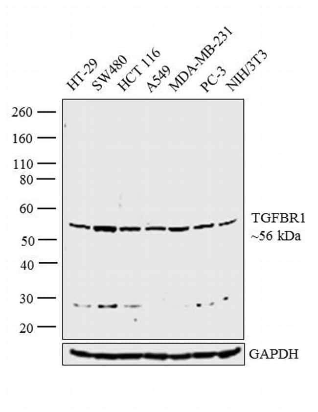 - Western blot analysis was performed on whole cell extracts (30 µg lysate) of HT-29 (Lane 1), SW480 (Lane 2), HCT 116 (Lane 3), A549 (Lane 4), MDA-MB-231 (Lane 5), PC-3 (Lane 6) and NIH/3T3 (Lane 7). The blot was probed with Anti-TGFBR1 Polyclonal Antibody (Product # PA1-38737, 1:500 dilution) and detected by chemiluminescence using Goat anti-Rabbit IgG (H+L) Superclonal™ Secondary Antibody, HRP conjugate (Product # A27036, 0.25 µg/mL, 1:4000 dilution). A 56 kDa band corresponding to TGFBR1 was observed across the cell lines tested.