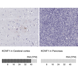 - Immunohistochemistry analysis in human cerebral cortex and pancreas tissues using Anti-KCNF1 antibody. Corresponding KCNF1 RNA-seq data are presented for the same tissues.