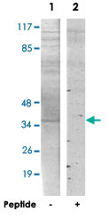 - Western blot analysis of extracts from HT-29 cells, using PMEPA1 polyclonal antibody (Cat # PAB17430).Peptide "+" means "with peptide blocking".