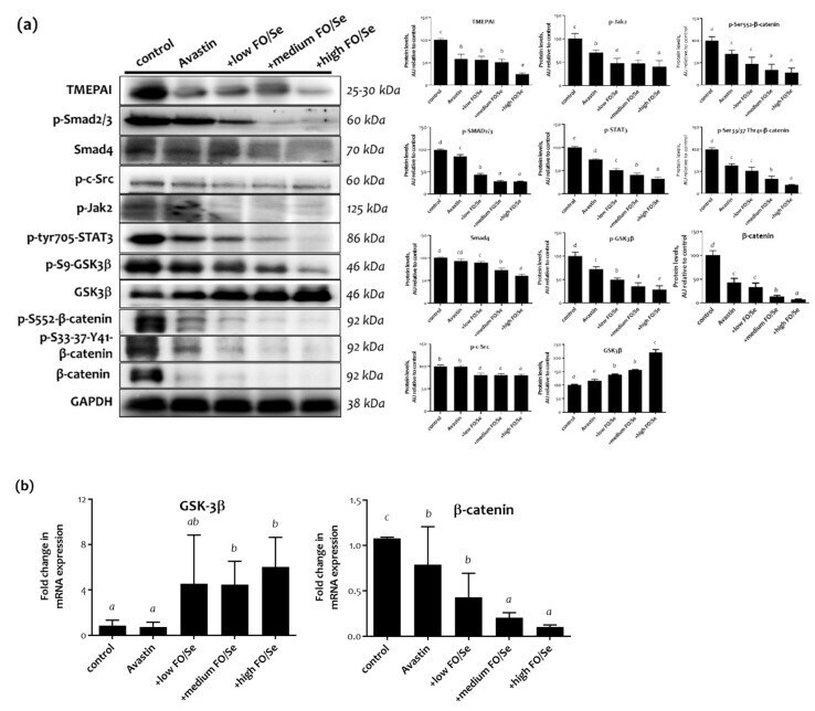 - Figure 5 Expression of c-Src-Jak2-STAT3-TMEPAI-Smad and GSK3 beta/beta-catenin signaling. ( a ) Protein levels of c-Src-Jak2-STAT3-TMEPAI-Smad and GSK3beta/beta-catenin, and ( b ) relative GSK3beta and beta-catenin mRNA in tumor tissues of 4T1 tumor-bearing mice were determined by qRT-PCR. Values are expressed as relative reading (mean +- SEM) from at least three or four independent observations. Bars with different superscripts ( a, b, c, and d ) are significantly different ( p < 0.05). Details of groups illustrated are as Figure 1 . TMEPAI = prostate transmembrane protein androgen induced 1; GSK3beta = glycogen synthase kinase 3beta.