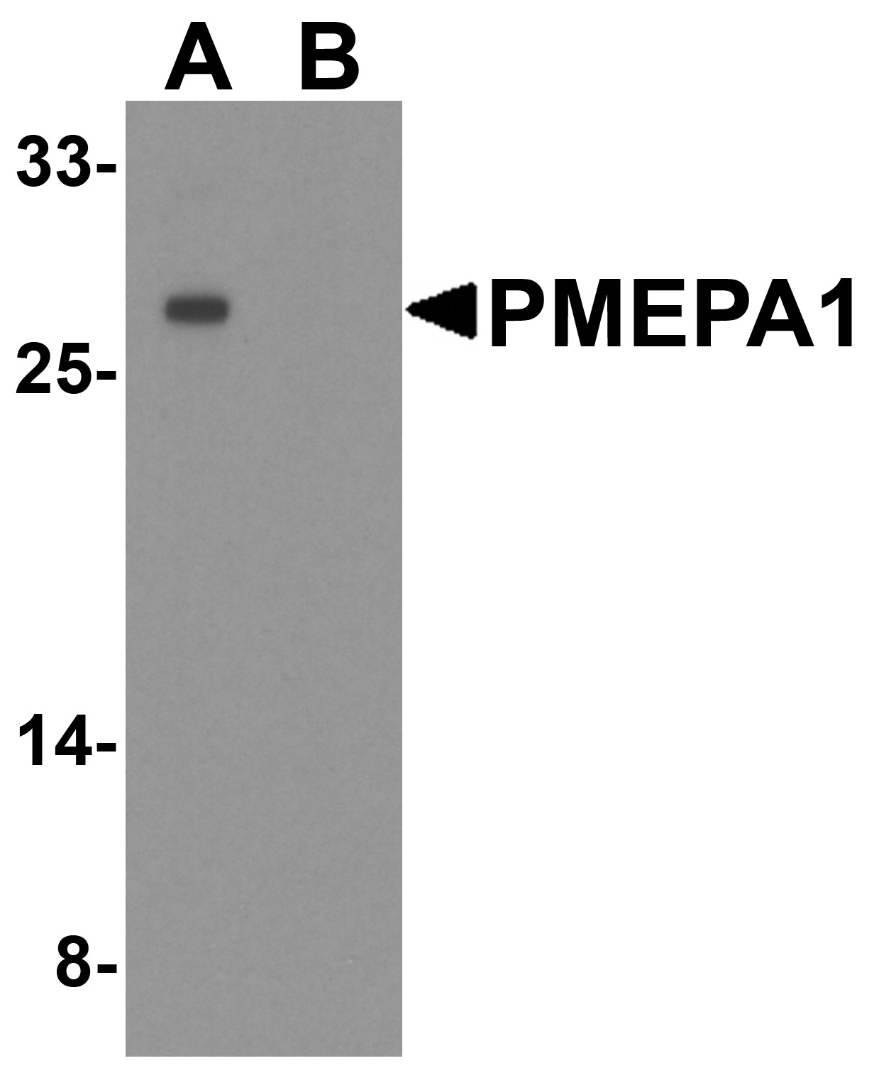 - Western blot analysis of PMEPA1 inA549 cell lysate with PMEPA1 antibody at 1 μg/ml in (A) the absence and (B) the presence of blocking peptide.