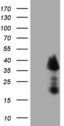 - HEK293T cells were transfected with the pCMV6-ENTRY control (Left lane) or pCMV6-ENTRY TCEAL1 (RC219873, Right lane) cDNA for 48 hrs and lysed. Equivalent amounts of cell lysates (5 µg per lane) were separated by SDS-PAGE and immunoblotted with anti-TCEAL. Positive lysates LY417752 (100 µg) and LC417752 (20 µg) can be purchased separately from OriGene.