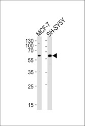 - "Western blot analysis of lysates from MCF-7, SH-SY5Y cell line (from left to right), using ZBTB22 Antibody (C-term)(Cat. #AP17466b). AP17466b was diluted at 1:1000 at each lane. A goat anti-rabbit IgG H&L(HRP) at 1:5000 dilution was used as the secondary antibody. Lysates at 35ug per lane. "