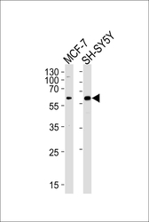 - Western blot: 35 µg of MCF-7, SH-SY5Y cell line (from left to right) stained with ARG55024 anti-ZBTB22 antibody at 1:1000 dilution.