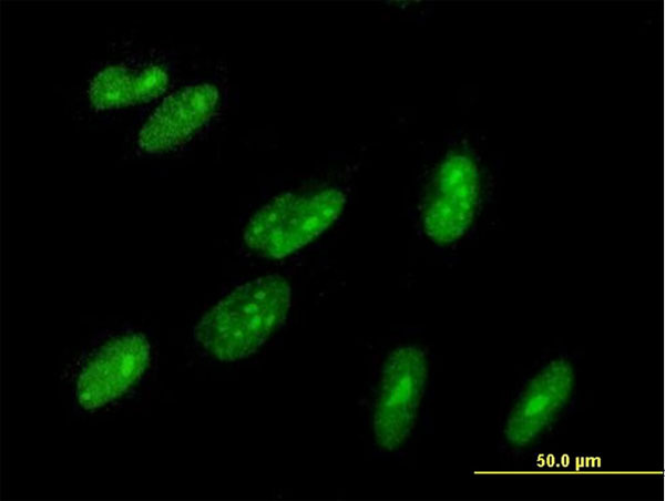 - Immunofluorescence of purified MaxPab antibody to ZBTB22 on HepG2 cell. [antibody concentration 10 ug/ml]