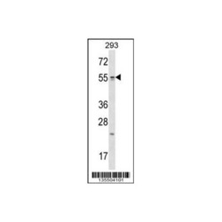 - TTC23 Antibody (Center) (Cat. #OAAB11571) western blot analysis in 293 cell line lysates (35µg/lane).This demonstrates the TTC23 antibody detected the TTC23 protein (arrow).