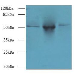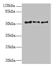 - Western blot. All lanes: TRIML1 antibody at 3 ug/ml. Lane 1: Mouse kidney tissue. Lane 2: Human placenta tissue. Lane 3: A431 whole cell lysate. Secondary antibody: Goat polyclonal to Rabbit IgG at 1:10000 dilution. Predicted band size: 53 kDa. Observed band size: 53 kDa.
